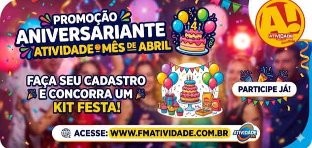 Se você faz aniversário no mês de ABRIL… essa é pra você! Vem aí a promoção ANIVERSARIANTE ATIVIDADE – MÊS DE ABRIL! 🎂🥳 Você pode ganhar um kit festa completo com bolo, refrigerante, salgadinhos, docinhos e muito mais pra comemorar do jeito que você merece! Pra participar é fácil: Acesse www.fmatividade.com.br ou ligue (35) 3 5 7 1-43 83 e faça seu cadastro! E essa festa tem parceiros especiais: 🍰 Que Seja Doce – Lilian Gonçalves: 9 99 47-41 04 🥐 Nair Salgados e Quitandas: 9 91 54-73 17 👉 Aniversariante Atividade – Abril é o seu mês, comemore com a gente! FM Atividade… a rádio feita pra todos! 🎶