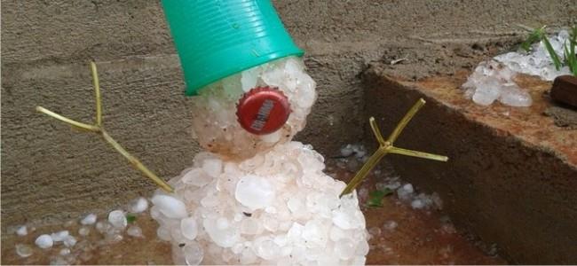 Moradora faz boneco com pedras de granizo que caíram em Monte Belo
