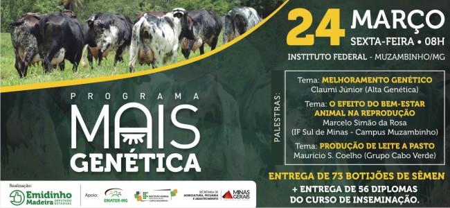 Evento acontece no Campus Muzambinho, no dia 24 de março, a partir das 8h.No próximo dia 24 de março o município de Muzambinho sediará um evento voltado ao melhoramento do gado na região. Trata-se do “Programa Mais Genética”, iniciativa do deputado Emidinho Madeira que conta com o apoio da Emater, do IFSULDEMINAS – Campus Muzambinho, do governo de Minas através da Secretaria de Estado de Agricultura, Pecuária e Abastecimento e das associações de municípios como a AMOG (Baixa Mogina), AMEG (Médio Rio Grande) e ALAGO (Lago de Furnas). Haverá palestras voltadas aos produtores rurais e doação dos itens do programa.
